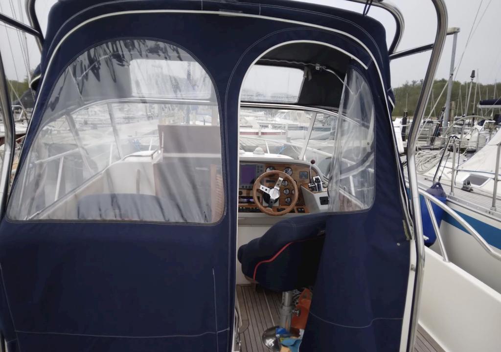 - Große Dunkelblaue Persenning, deckt den gesamten Steuerstand ab